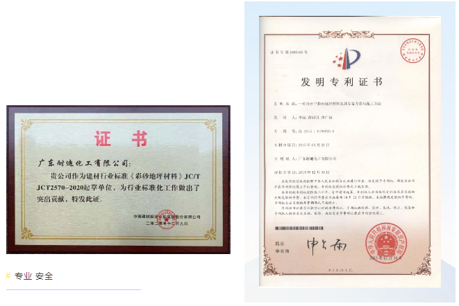 广东耐迪化工作为建材行业标准起草单位,参与了《彩砂地坪材料》JC/TJCT2570-2020标准编写。耐迪斯自流平彩砂不仅荣获中国发明专利(专利号:ZL201510194825.6),也符合《绿色建筑选用产品》要求。